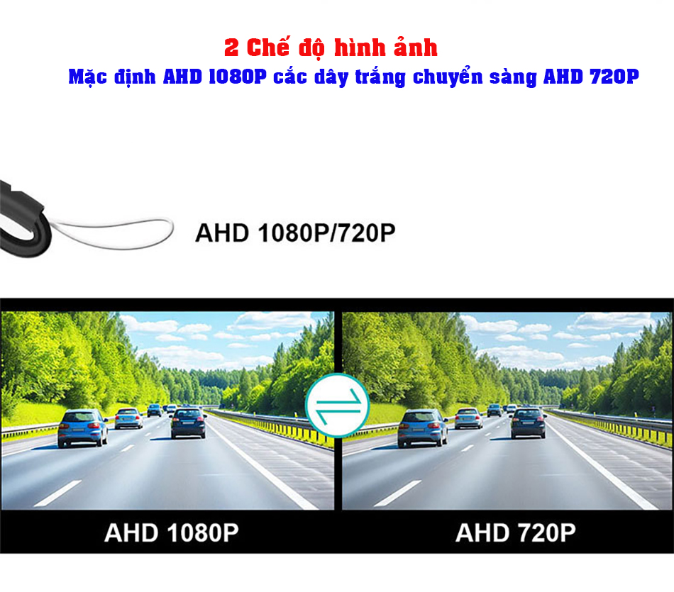 - Chuẩn hình ảnh AHD 1080/720P cho phép linh hoạt chuyển đổi độ phân giải từ AHD 1080P sang AHD 720P ( Mặc định 1080P cắt dây màu trắng trên mắt cam sẽ chuyển sang AHD 720P)