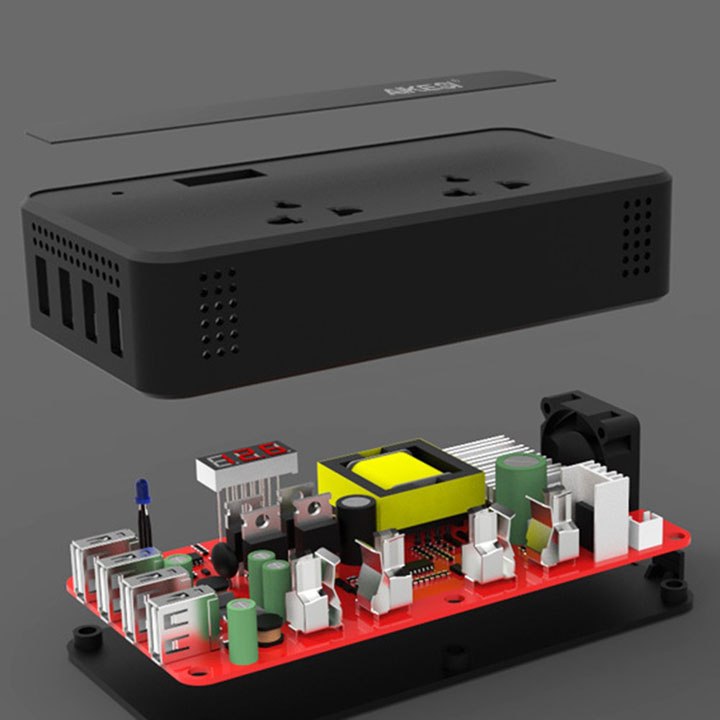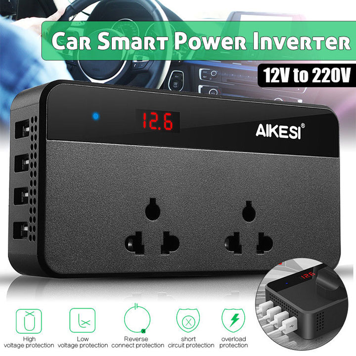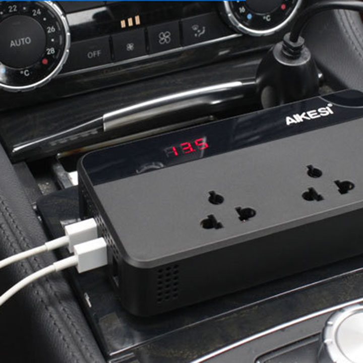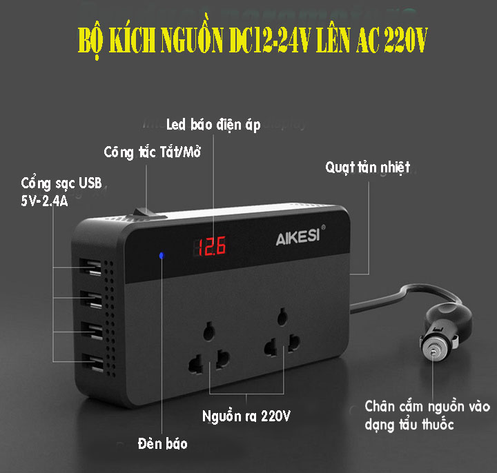 Bộ chuyển nguồn Dc12V/24V Lên AC 220V- 200W sử dụng trên ô tô Aikesi hay còn gọi là Bộ kích điện AKS9005 dùng để biến đổi điện áp 1 chiều từ acquy (điện áp DC) thành điện áp AC 220v dùng cho thiết bị điện dân dụng như laptop, thiết bị âm thanh ….