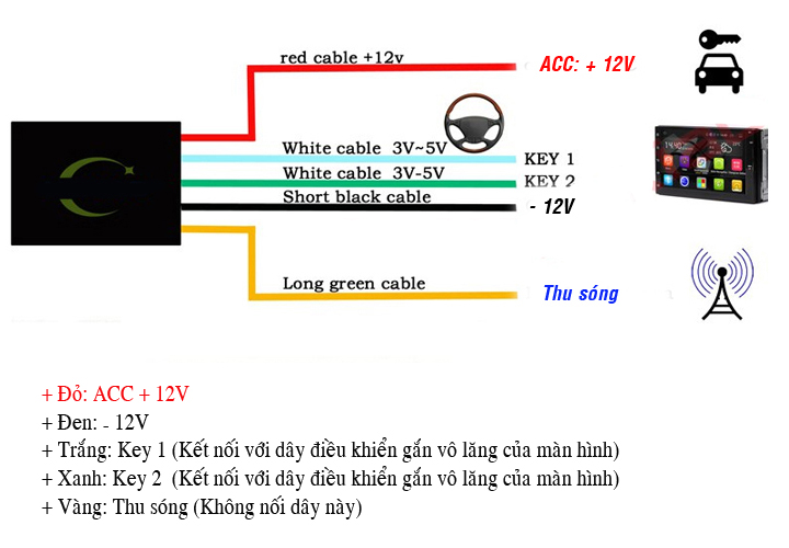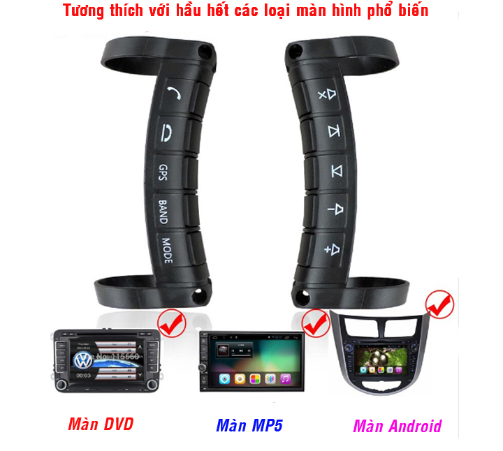- Tương thích với hầu hết các loại màn hình ô tô: Màn hình DVD, Màn hình MP5, Màn hình Android, các loại máy nghe nhạc có tích hợp chức năng điều khiển trên lăng