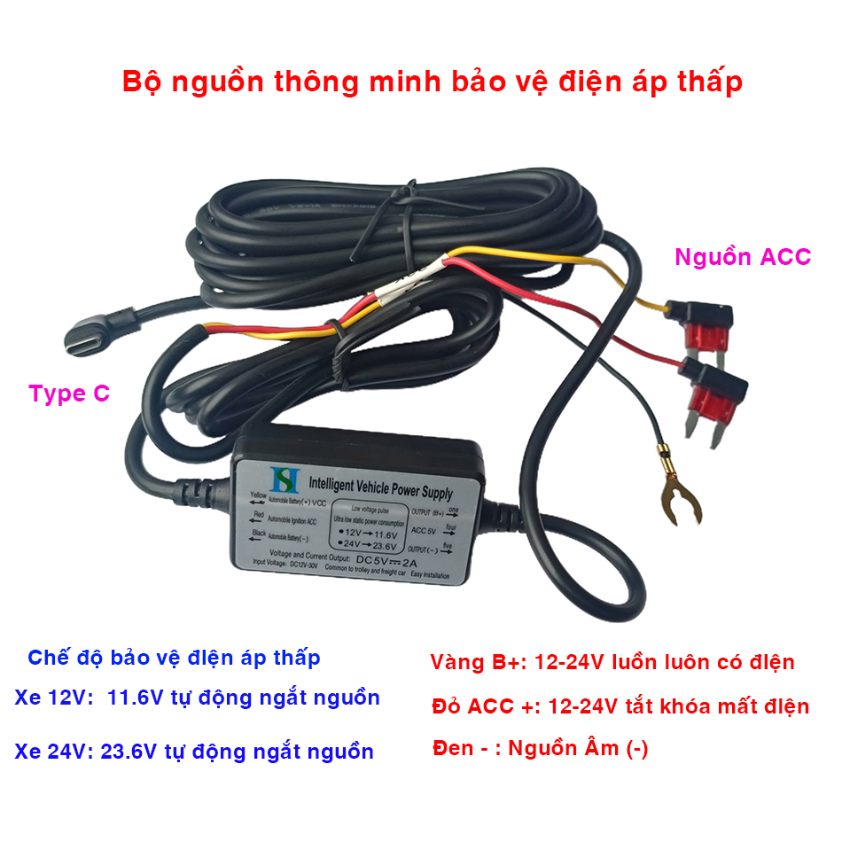 Đối với xe điện 24V :Khi điện áp bình ắc quy giảm xuống 23.6 V camera sẽ tự động ngừng ghi hình