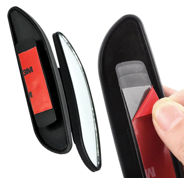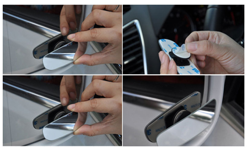 Gương cầu lồi được gắn lên gương chiếu hậu ô tô bằng băng dính 3m chắc chắn, nhanh chóng.