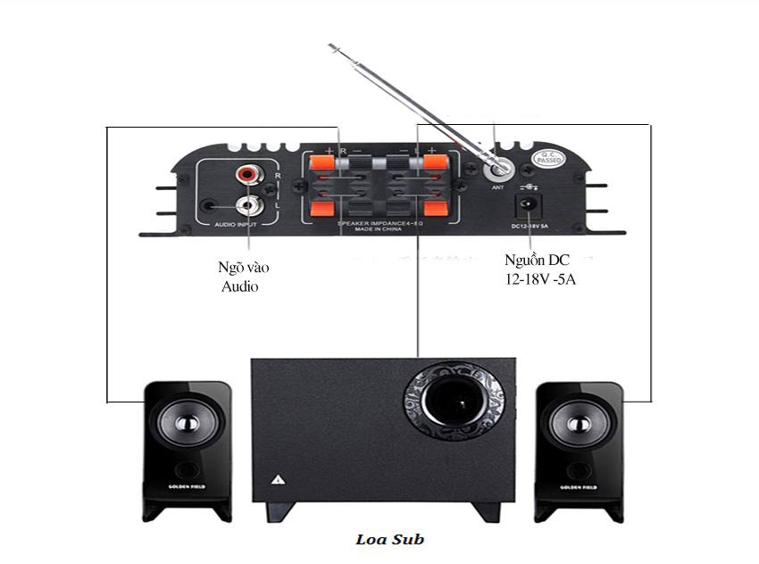 * Bộ Ampli Mini 12V Hifi 2.1 LP168USB độ âm thanh xe hơi (Kèm nguồn)