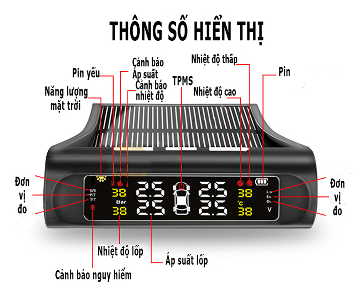 Thiết bị cảm biến áp suất và nhiệt độ lốp TPMS thông minh này sẽ có cảnh báo bằng âm thanh và hình ảnh tới bạn mỗi khi áp suất lốp quá thấp < 1,8 Bar hoặc > 3,2 Bar hoặc nhiệt độ lốp > 70*C