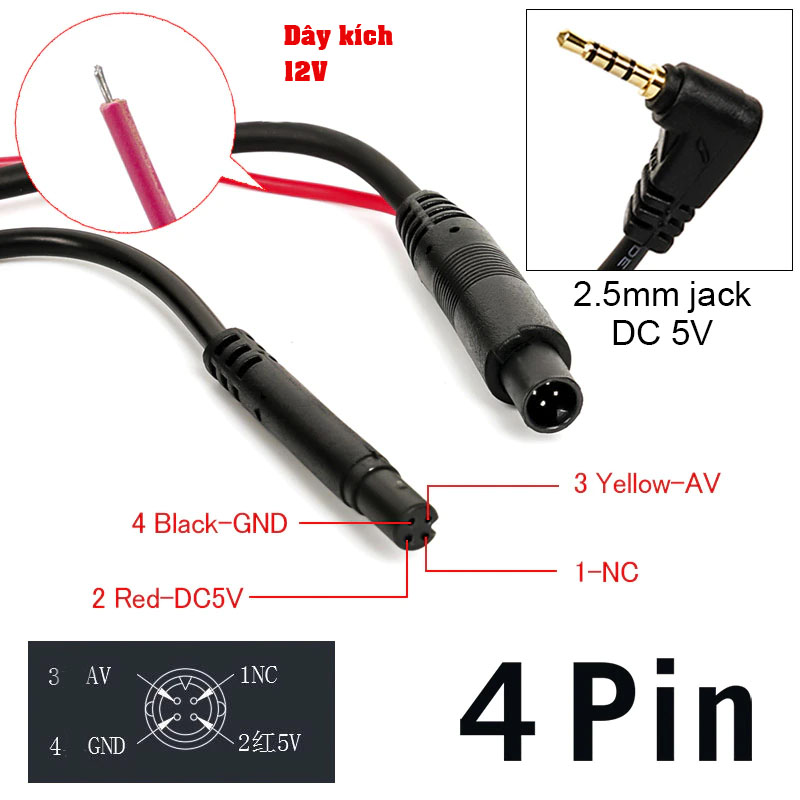 Nguồn điện sử dụng: Rắc 2.5mm là 5V, dây kích cam lùi là 12V