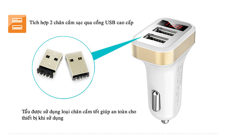 - 2 Cổng sạc USB tự động nhận biết điện áp sạc + phát hiện khả năng tương thích
