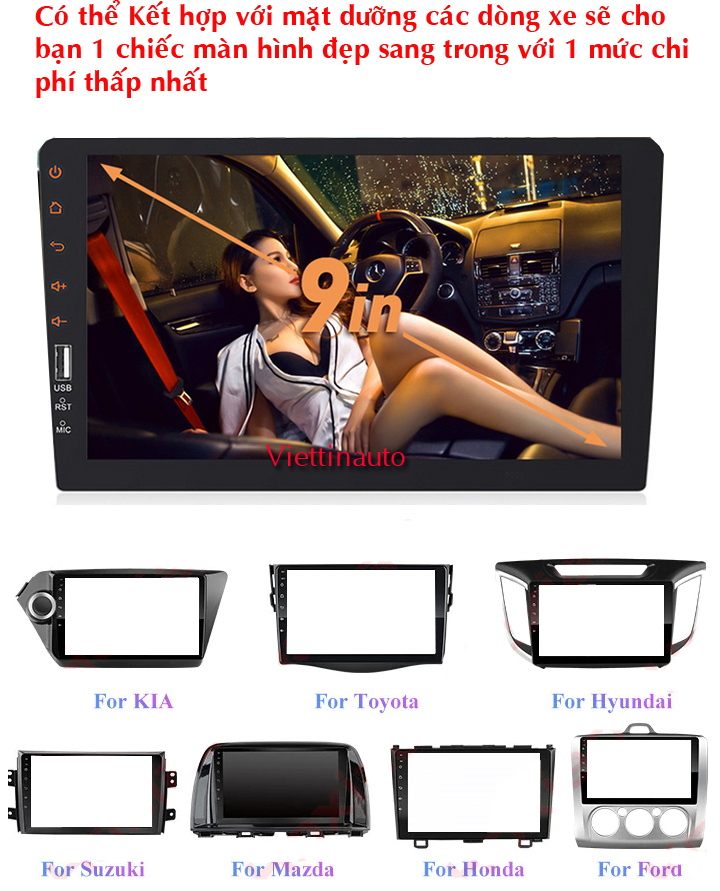 * Có thể độ chế cho các dòng xe tải, xe con không có mặt dưỡng 9 In để lắp màn hình