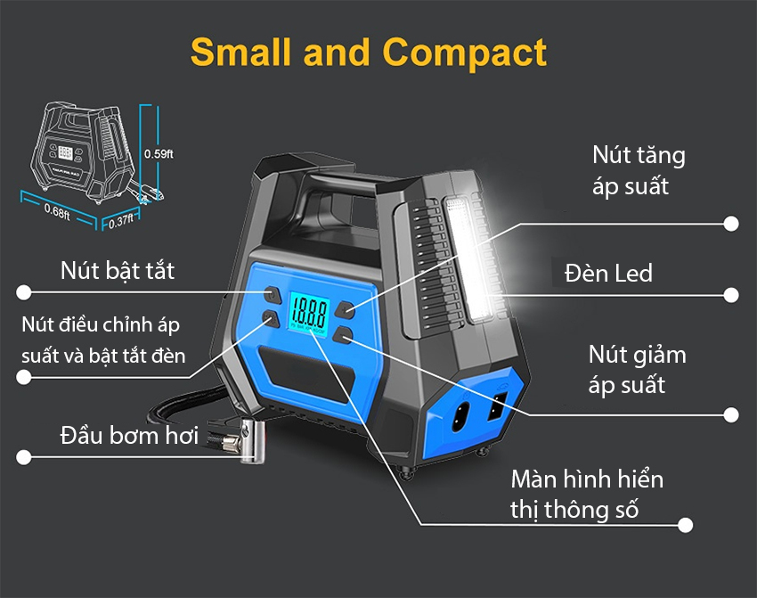 - Dây bơm theo máy dài: 60cm (cuộn gọn trong máy)