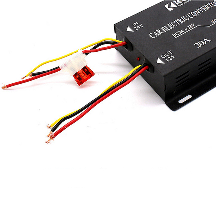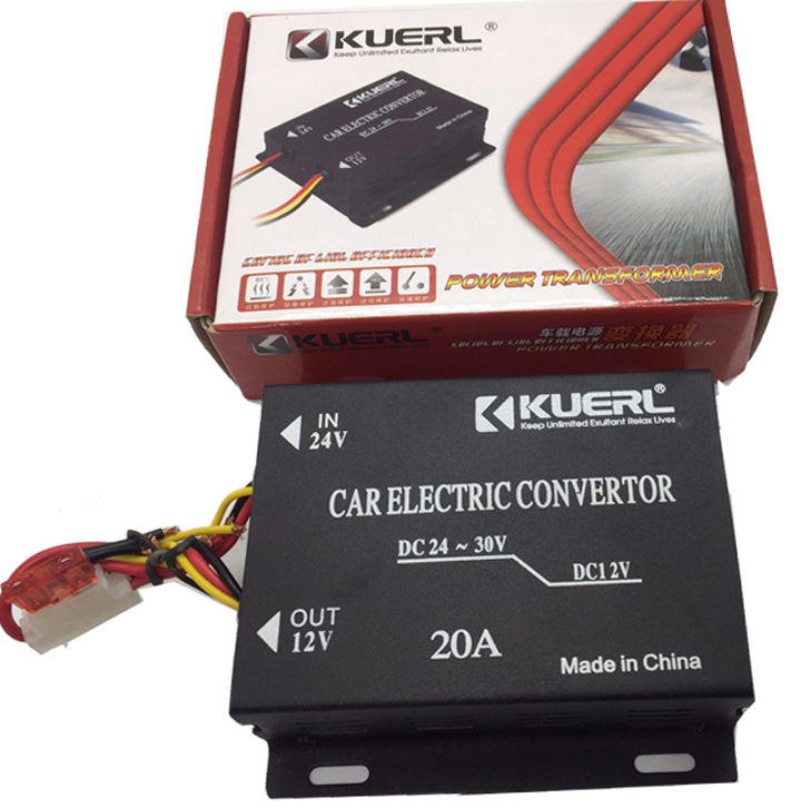 - Bộ đổi nguồn DC 24V sang DC 12V chính hãng KUERL cho Ô tô 20A:Là bộ adapter chuyển đổi điện áp 1 chiều DC24v-36V xuống dòng điện 1 chiều DC12v -20A chuyên dụng dành riêng cho Ô tô.