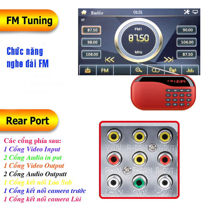 * Tích hợp cổng kết nối với Camera lùi tiện lợi giúp dễ dàng quan sát khi lùi xe mà không mất thêm chi phí để lắp đặt thêm màn hình.
