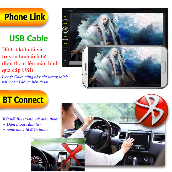 * Hỗ trợ kết nối bluetooth giúp bạn dễ dàng kết nối điện thoại, máy tính bảng với màn hình để nghe nhạc từ điện thoại hay máy tính bảng, hay đàm thoại rảnh tay trong lúc lái xe
