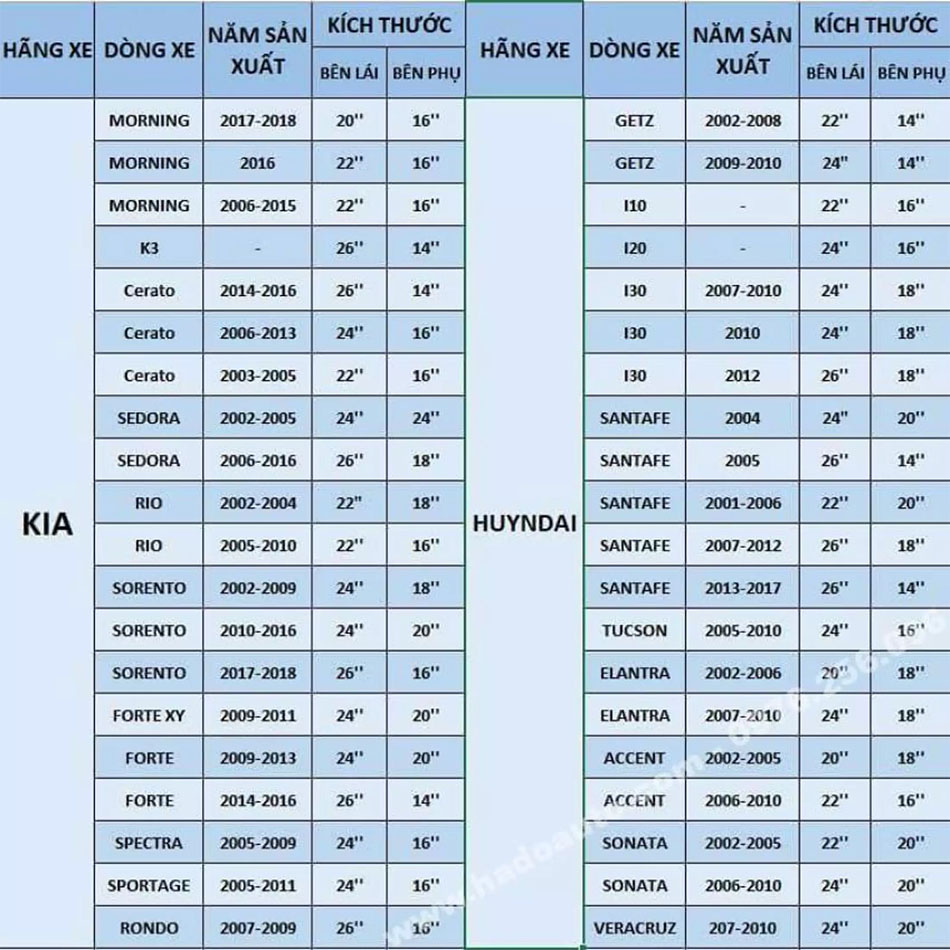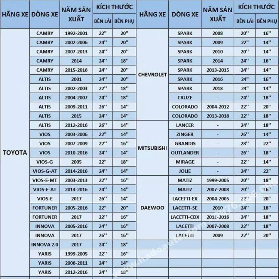 BẢNG THAM KHẢO KÍCH THƯỚC GẠT MƯA MỘT SỐ DÒNG XE