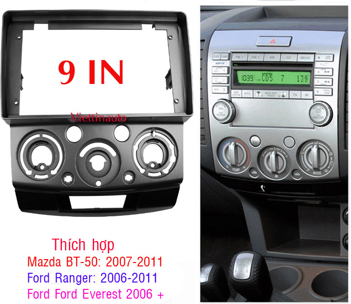 Tên sản phẩm: Mặt dưỡng màn hình 9 In xe Ford Ranger, Ford Everest, Mazda BT50 2006-2011