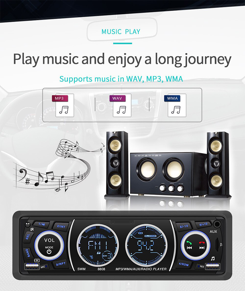 Máy nghe nhạc Bluetooth, đài FM, máy nghe nhạc MP3 xe hơi 8808 là dòng máy cao cấp, với nhiều tính năng và ưu điểm