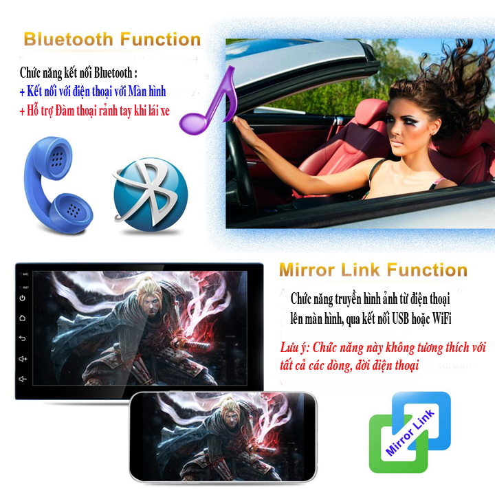 * Hỗ trợ kết nối bluetooth giúp bạn dễ dàng kết nối điện thoại, máy tính bảng với màn hình để nghe nhạc từ điện thoại hay máy tính bảng, hay đàm thoại rảnh tay trong lúc lái xe